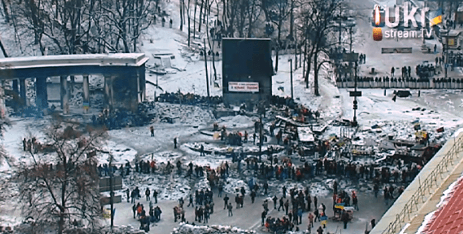 На центральной площади столицы митингующим показывают фильм "Пропавшая грамота", перед сценой стоит несколько сотен человек с флагами. На баррикадах стоят немногочисленные патрули отрядов самообороны Майдана, при этом правоохранители на всех из них, кроме ул.Грушевского, отсутствуют, передает "Интерфакс-Украина".