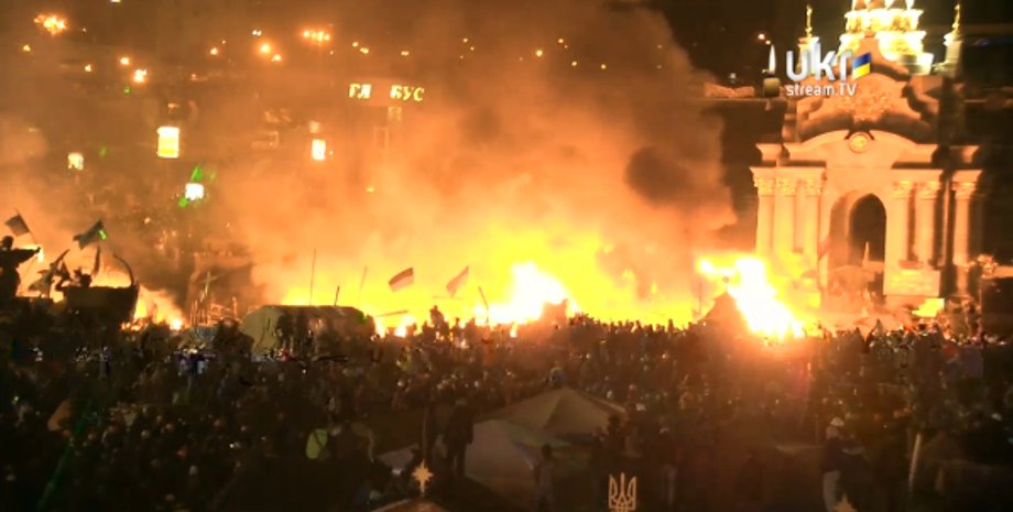 При этом участники Евромайдана подожгли БТР правоохранителей, который подъехал к баррикаде на ул. Крещатик