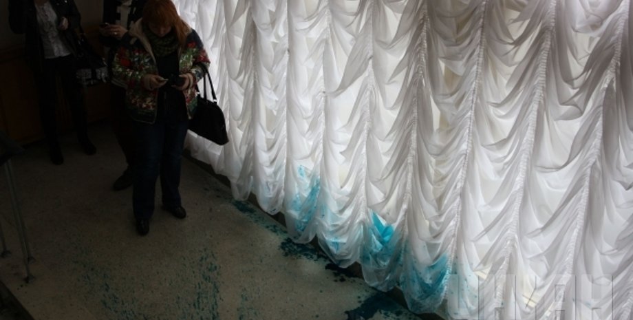 В Житомире во время перерыва на сессии областного совета общественные активисты облили на лестнице облсовета зеленкой экс-губернатора области Сергея Рыжука