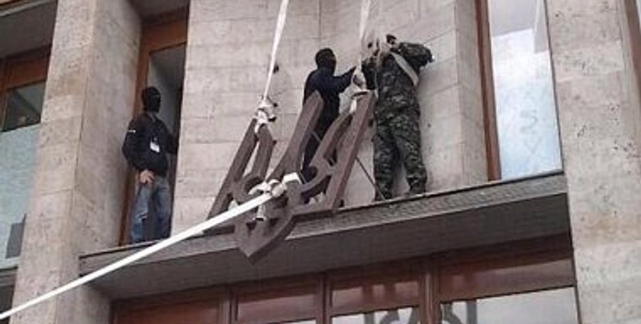 15 апреля неизвестные в балаклавах сняли и сбросили герб Украины со здания Донецкой областной государственной администрации