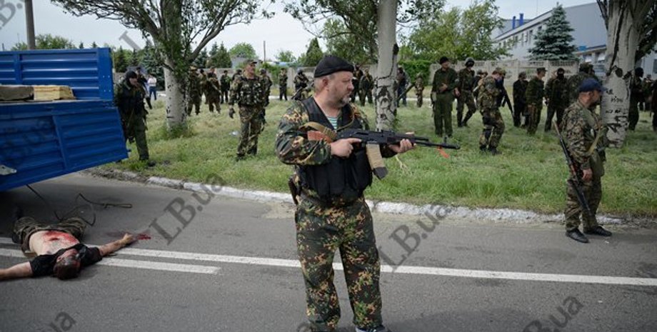 По словам боевиков, убитый ими мужчина является членом "Правого сектора", у них якобы есть еще трое убитых. На теле убитого мужчины видна большая резанная рана в районе сердца.