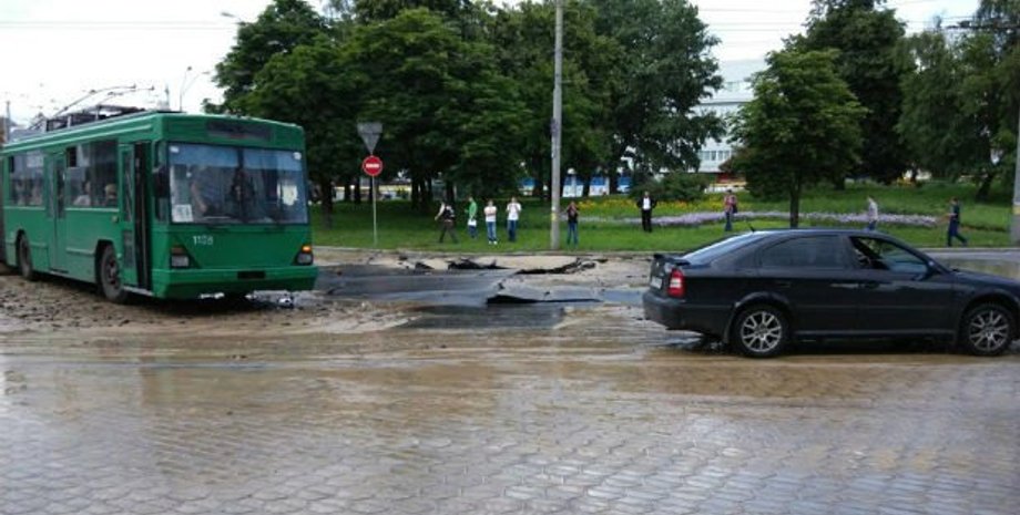 В связи с повреждением магистрального трубопровода диаметром 1000 мм произошла утечка на поверхность охлажденной теплосетевой воды. "В результате на проезжей части образовалась вымоина диаметром примерно 4 метра", - отмечается в сообщении.