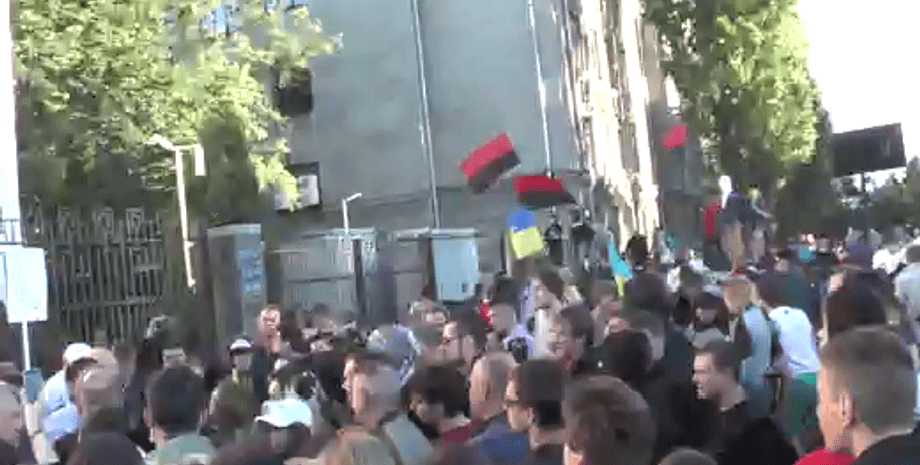 После участники акции начали забрасывать здание взрывными пакетами. Протестующие продолжают громить автомобили дипломатов и забрасывать здание посольства яйцами, частями автомобилей и камнями. Уже разбито несколько окон.