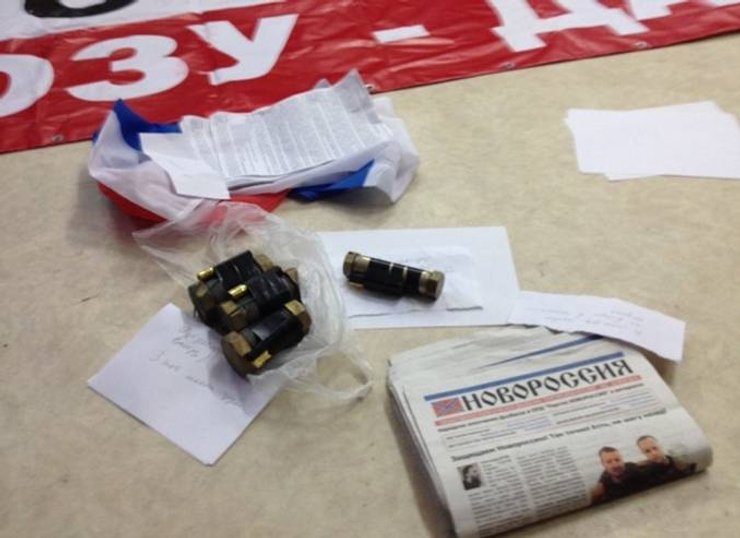 Также изъяты сепаратистские газеты "Новороссия" и листовки с призывами к нарушению территориальной целостности Украины и четыре самодельных взрывных устройства.
