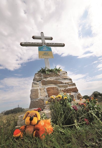 На поле квадратами примята пшеница: здесь стояли палатки, в которых дежурили сотрудники МЧС. Последняя машина со специалистами отбывает с места. Чуть ниже, в самом поселке Грабово, семья укладывает сено в стог. Через дорогу от их дома на выжженной земле лежит фюзеляж "Боинга". Когда самолет падал, сено разлетелось по округе. Теперь собирают.