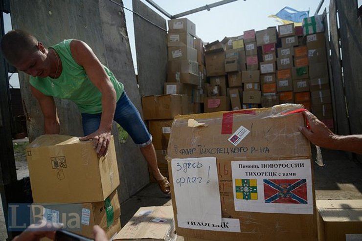 Среди найденных запасов есть ящики с гуманитарной помощью, которая, судя по надписям, предназначена "Новороссии" и направлена из различных российских городов - Нового Уренгоя, Воронежа, Сыктывкара, Екатеринбурга и др. На ящиках есть наклейки и надписи российских партий ЛДПР Владимир Жириновского и КПРФ Геннадия Зюганова.