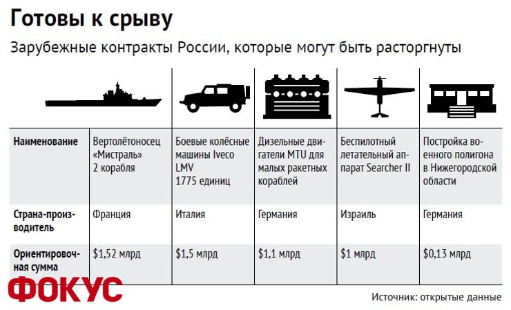 Пока большинство таких контрактов не отменено, а только приостановлено, но это все равно накладывает ограничения на российскую программу перевооружения. "Даже если поставки "Мистралей" не сорвутся, мы будем просить Париж не заключать контракты на их обслуживание", — говорит Фокусу сотрудник Торгового представительства США (USTR) Кейтр Вильяреаль. Под угрозой оказались поставки на многие миллиарды: объем только пяти крупнейших контрактов России превышает $5 млрд (см. Готовы к срыву).