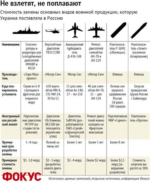 "Мы ничего не поставляем России", — заявили Фокусу на заводе "Мотор Сич" — еще одном предприятии, работавшем на российский ВПК. До последних событий Москва ежегодно закупала в Украине более 200 двигателей для боевых вертолетов, необходимых для обновления парка машин. Заменить их России нечем. В 2004-м под Петербургом началось строительство завода — аналога запорожского "Мотор Сич". Но оно не закончено: в 2015 году завод при конструкторском бюро имени Камова выпустит лишь 40 двигателей, и только к 2018–2020 годам их производство могут поставить на поток.