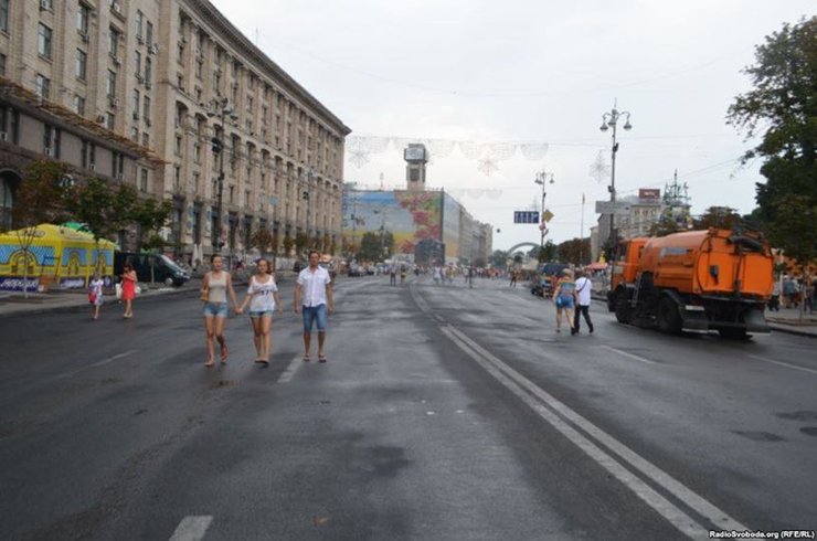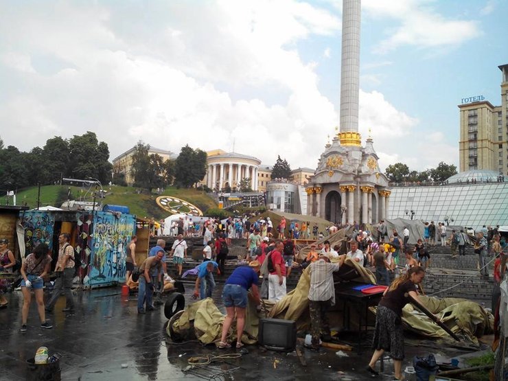 К вечеру люди, которые пришли на уборку Крещатика, разошлись по домам. Коммунальные службы еще работают. Люди, жившие в сожженных палатках, собираются вокруг сцены. Они запретили ее разбирать, поскольку завтра хотят провести традиционное воскресное вече.