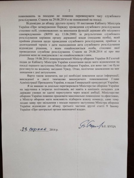 Буца сообщает, что министр обороны Валерий Гелетей еще 19 августа подал в Кабмин ходатайство о восстановлении его в должности, но оно не было рассмотрено. Он также сообщил, что передал в Генеральную прокуратуру все необходимые объяснения относительно предъявленных ранее ему обвинений.