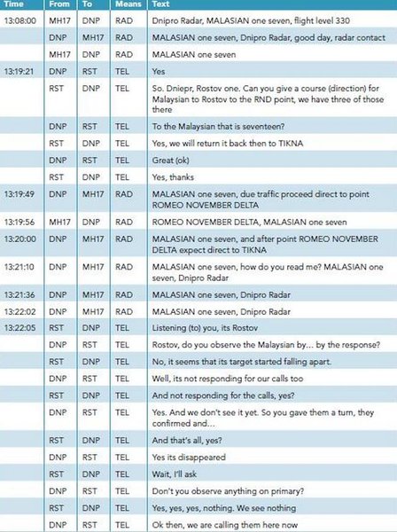 Ниже приводится перевод переговоров между пилотами (MH17), днепропетровскими (DNP) и ростовскими (RST) диспетчерами: