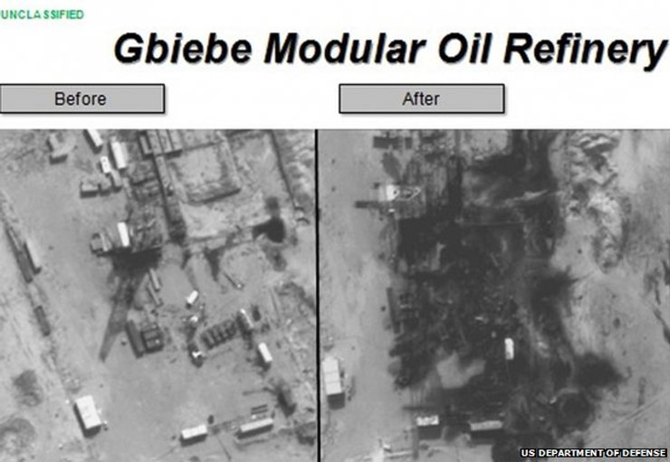 Запись авиаударов по НПЗ обнародована Центральным командованием вооруженных сил США в Twitter. Это события третьего дня бомбардировок. Пентагон обнародовал также фотографии с видом на НПЗ в Гбибе до и после бомбардировок.