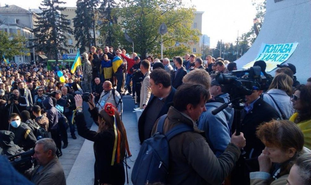 Участники акции пели гимн Украины, кричалки про Путина и Новороссию и провели митинг в центре города