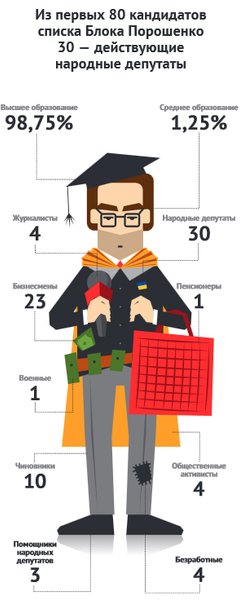Большинство кандидатов в народные депутаты от Блока Петра Порошенко — действующие парламентарии, представители крупного бизнеса и региональные партфункционеры. Места в списке нашлись и для деятелей режима Януковича
