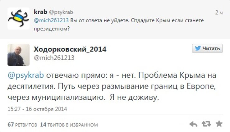 Экс-глава ЮКОСа Михаил Ходорковскийне вернет Крым Украине, если станет президентом России. Об этом он сообщил в Twitter, отвечая на соответствующий вопрос пользователя соцсети.