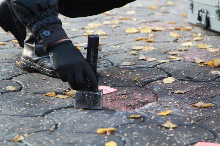 Прибыв на место происшествия, правоохранители во дворе возле офиса обнаружили воронку диаметром 12-15 см и глубиной 4 см, порядка 50 осколков.