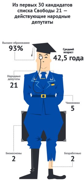 Список Свободы из всех рейтинговых партий можно назвать самым консервативным: ни одного "легионера", сплошь партийцы, как правило, с многолетним стажем. В списке партии — 21 действующий депутат, 25 депутатских помощников (рекорд среди всех партий) и все без исключения главы областных парторганизаций. Кандидатами от партии стали и скандальные партийцы — Игорь Мирошниченко и Ирина Фарион.