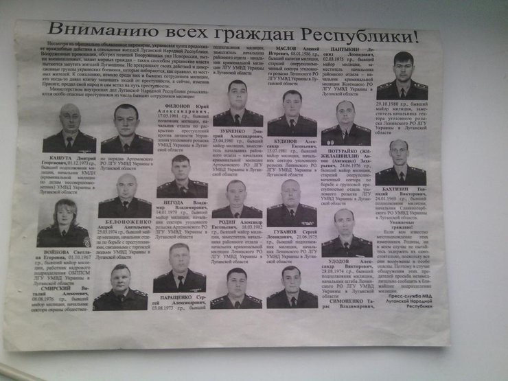 В перечне указаны имена, звания и должности 17-ти украинских милиционеров. В частности, террористы разыскивают полковника милиции Юрия Филонова, подполковников Дмитрия Кашуту, Сергея Паращенко, Сергея Губанова, Александра Удодова, Геннадия Бахтизина и других.