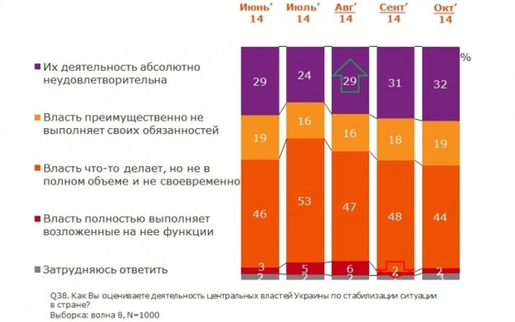 Так же неизменными остаются оценки респондентами деятельности центральных властей Украины. 44% считают, что власти не в полном объеме и не своевременно исполняют свою работу, а 32% абсолютно не удовлетворены их деятельностью. Еще 19% считают, что власть, в большинстве случаев, не выполняет своих обязанностей, и только 2% считают, что власть полностью выполняет свои функции.