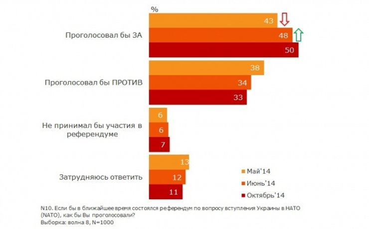 Половина респондентов в октябре проголосовали бы за вступление Украины в НАТО. Мужчины (57%) больше хотят в НАТО, чем женщины (42%). И чем старше респондент, тем меньше он поддерживает идею о вступлении Украины в Альянс.