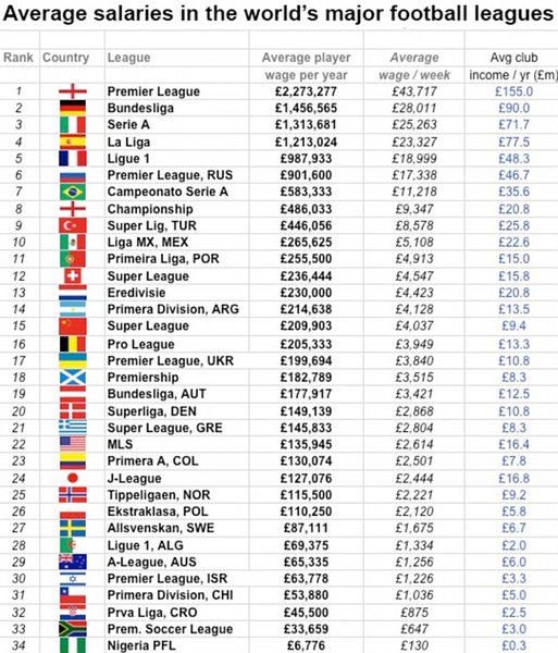 Украинская Премьер-лига занимает 17 место – в среднем каждый игрок элитного дивизиона Украины зарабатывает в год по 199 тысяч фунтов стерлингов (4,8 млн гривен), в неделю футболисты получают по 3,8 тысячи фунтов (93 тысячи гривен).