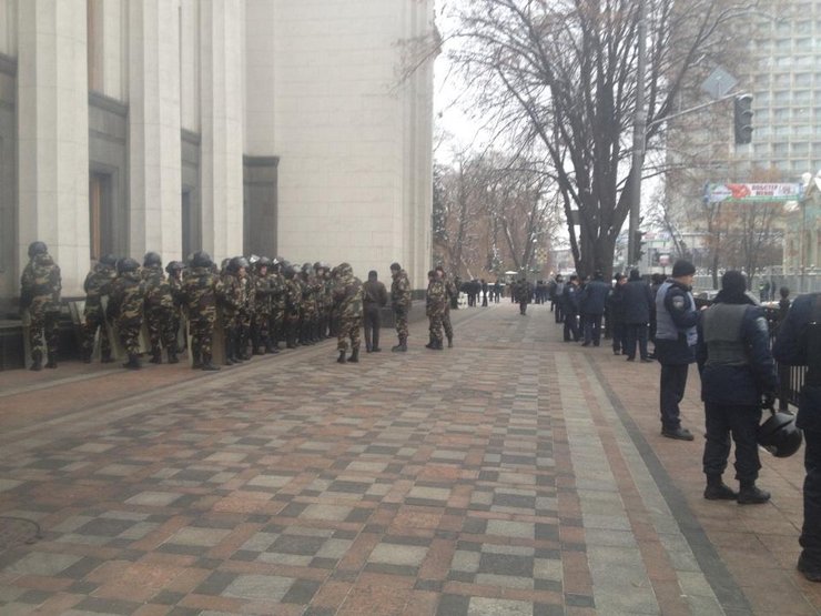 Они расположились по периметру здания парламента, сообщает в Twitter журналист программы Сергей Андрушко.