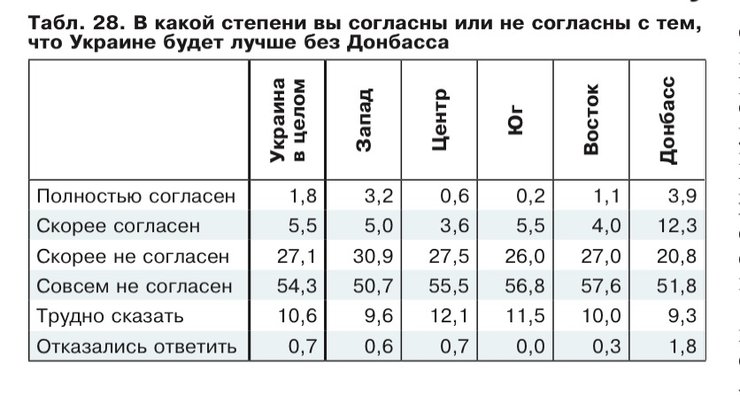 Только 1,8% украинцев "полностью согласны" с тем, что Украине будет лучше без Донбасса.