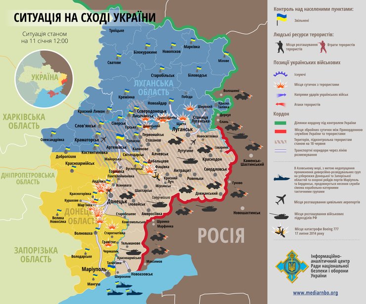Пресс-центр СНБО предоставил карту ситуации на востоке Украины по состоянию на 12.00 воскресенья, 11 января