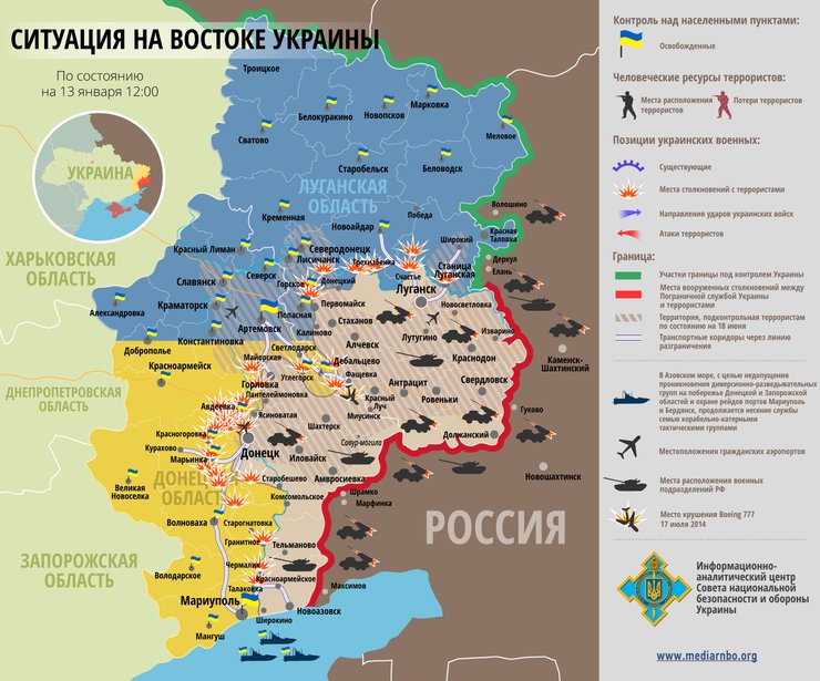 Пресс-центр СНБО предоставил карту ситуации на востоке Украины по состоянию на 12.00 вторник, 13 января
