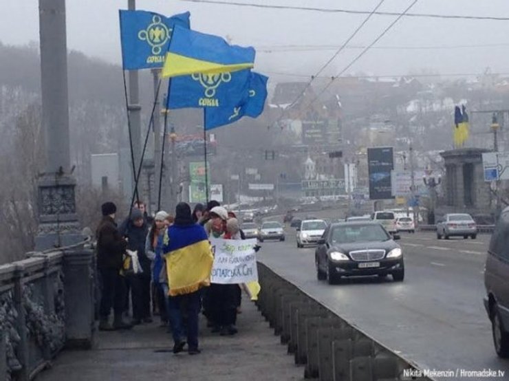 Утром в Киеве на мосту Патона организовали акцию "Цепь Единения" - участники взялись за руки, образовав символическую живую цепь.
