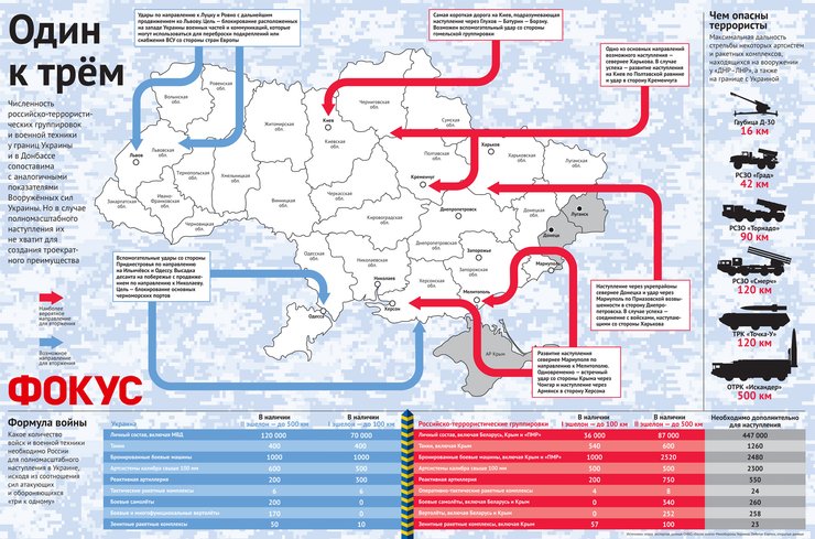 Численность российско-террористических группировок и военной техники у границ Украины и в Донбассе сопоставима с аналогичными показателями Вооруженных сил Украины. Но в случае полномасштабного наступления их не хватит для создания троекратного преимущества.