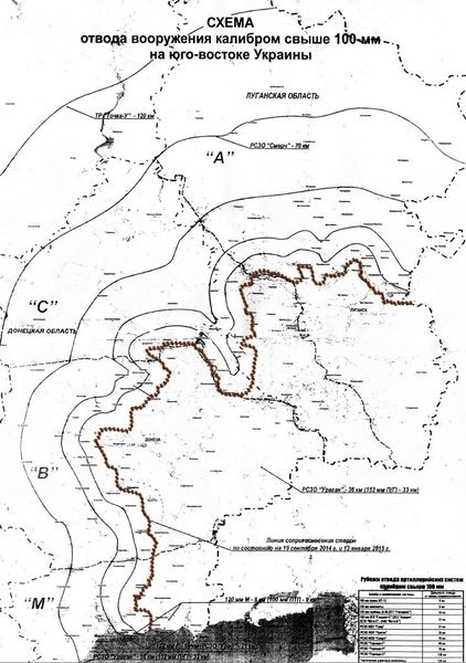 "Но что же это за "фактическое" прохождение линии соприкосновения? — спрашивает автор статьи. – К посланию, в самом деле, прилагается любопытная карта — "Схема отвода вооружения калибром свыше 100 мм на юго-востоке Украины". На ней штрих-пунктиром проведена линия, загадочно обозначенная, как "Линия соприкосновения сторон по состоянию на 19 сентября 2014 г. и 13 января 2015 г.". Но за время "перемирия", начиная с сентября, силы боевиков значительно продвинулись в западном направлении: по официальным оценкам, боевики откусили более 550 кв км территории. Даже еще во время самих переговоров в Минске сепаратисты заняли 28 населенных пунктов".