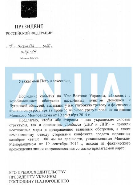 Копия письма президента России Владимира Путина президенту Украины Петру Порошенко, в котором, как трубили российские СМИ, якобы содержится "мирный план" президента РФ.