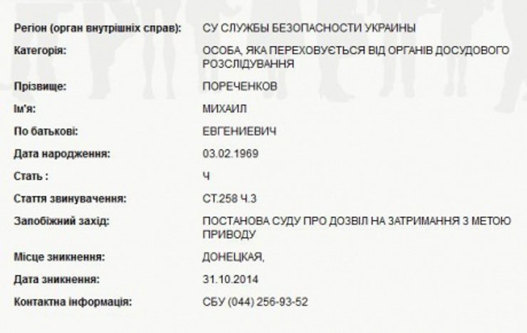 СБУ обозначила, что Пореченков исчез в Донецкой области 31 октября 2014 года.