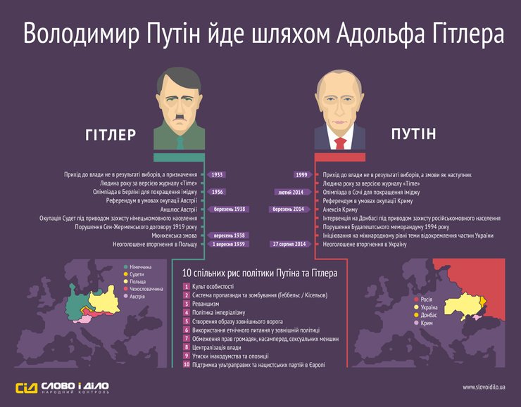 На сегодняшний день уже никто не видит ничего крамольного в коллажах Владимира Путина с усами в стиле Адольфа Гитлера. Но мало кто систематизировал признаки и критерии сходства. Если взять хронологию событий в первой половине ХХ века и сравнить с нынешней ситуацией, то точность аналогии просто поражает