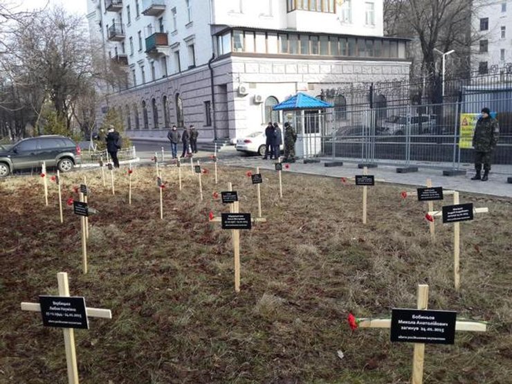 В Киеве у российского посольства активисты установили кресты в память погибших при теракте в Мариуполе, передает "РБК-Украина".