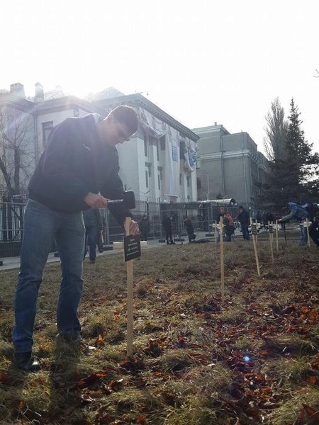 Несколько участников акции на клумбе перед зданием посольства установили кресты с именами погибших. К каждому кресту активисты возложили цветы.