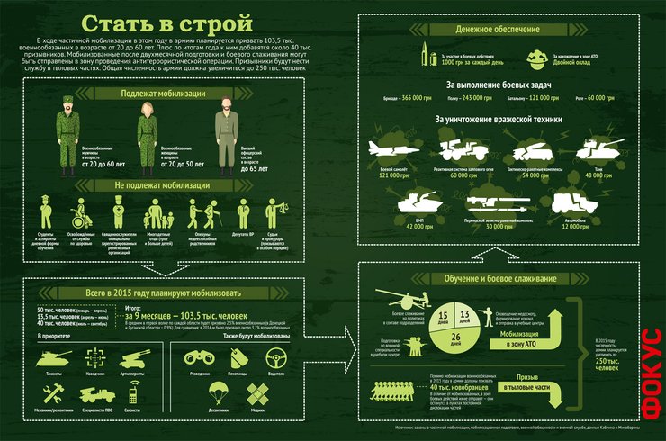 В ходе частичной мобилизации в этом году в армию планируется призвать 103,5 тыс. военнообязанных в возрасте от 20 до 60 лет. Плюс по итогам года к ним добавятся около 40 тыс. призывников. Мобилизованные после двухмесячной подготовки и боевого слаживания могут быть отправлены в зону АТО. Призывники будут нести службу в тыловых частях. Всего численность армии должна увеличиться до 250 тыс. человек