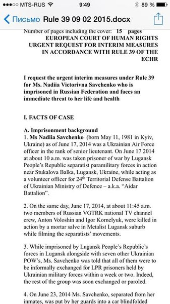 Адвокаты Надежды Савченко подали заявление в Европейский суд по правам человека (ЕСПЧ) с просьбой срочно принять "предварительные меры" для рассмотрения ее дела. Соответствующий документ, датированный 9 февраля 2015 года, адвокат Савченко Марк Фейгин опубликовал в Facebook.