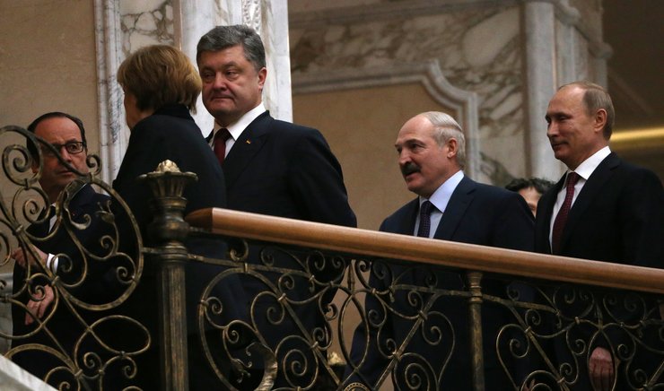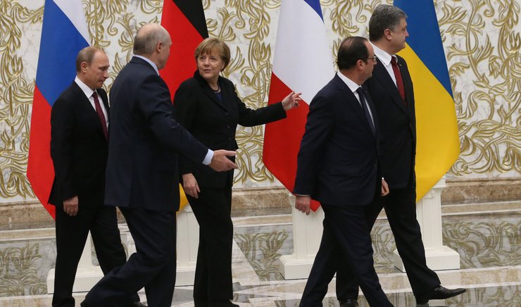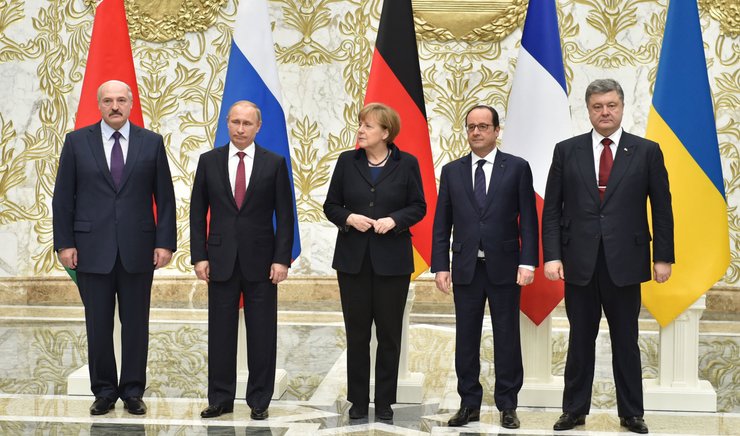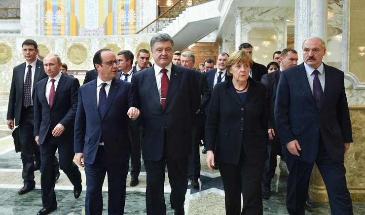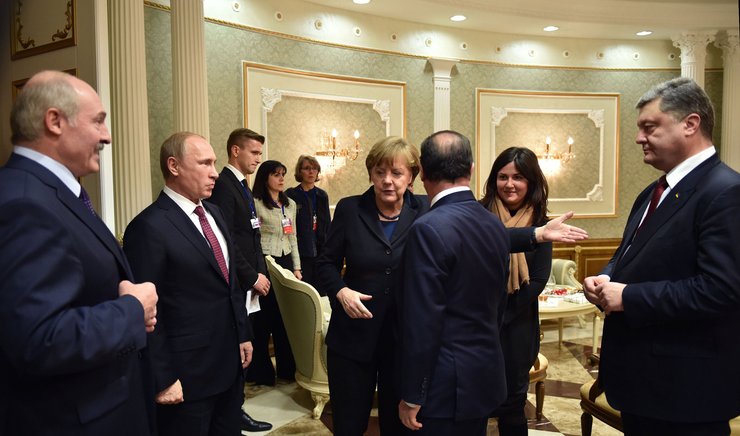 Франсуа Олланд на этой фотографии выглядит отрешенным, как будто происходящее его не слишком заботит. Он на чем-то акцентирует внимание, причем Ангела Меркель знает, о чем он говорит. Александр Лукашенко то ли слушает, то ли пытается понять смысл разговора, возможно, не зная языка.