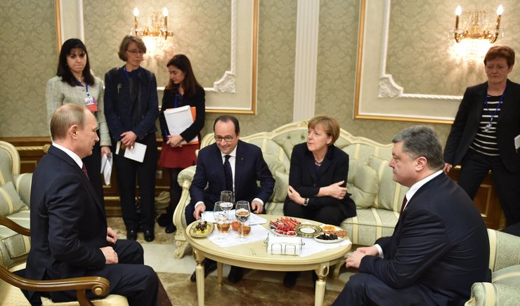 Похоже, произошло событие, заставившее всех напрячься. Лица напряжены даже у людей на втором плане. Поза Путина говорит о том, что он готов встать и уйти. Руки почти сжались в кулаки. Неестественно выпрямленная спина тоже свидетельствует о готовности ретироваться. У Меркель выжидательная закрытая поза: она чего-то ждет и при этом не расположена к Путину. Порошенко уставший, это видно по спине. Единственное исключение – Олланд. Хотелось бы знать, что его развеселило.