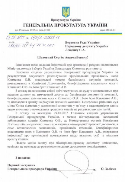 В связи с этим Генпрокуратура 29 января для подтверждения принадлежности заблокированных средств Александру Клименко обратилась напрямую в компетентные органы Лихтенштейна с просьбой помочь установить учредителей и сотрудников компаний братьев Клименко, а также получить информацию об уголовных производствах относительно них и основания ареста средств.