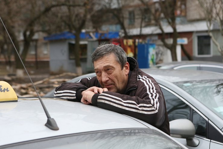 Таксиста зовут Сергей. У него потрепанная одежда и еле дышащий Lanos. Мужчине за 50, в мирное время Сергей работал инструктором в автошколе. С началом АТО спрос на водительские права сошел на нет, и он устроился таксистом. Разговор долго не вяжется — мужчина явно не привык откровенничать с чужими людьми.