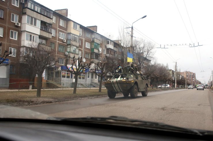 Выезжаем на одну из центральных улиц. Навстречу мчится БТР, на нем несколько солдат с автоматами в руках — обычная картина среди белого дня.