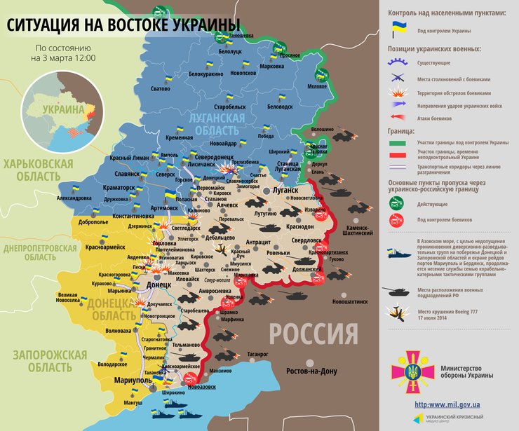 Пресс-центр СНБО предоставил карту ситуации на востоке Украины по состоянию на 12.00 вторника, 3 марта