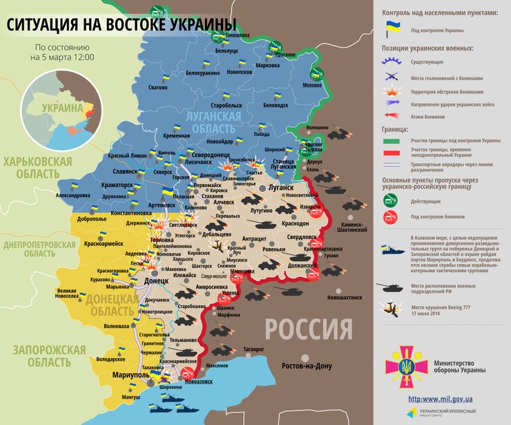 Пресс-центр СНБО предоставил карту ситуации на востоке Украины по состоянию на 12.00 четверга, 5 марта
