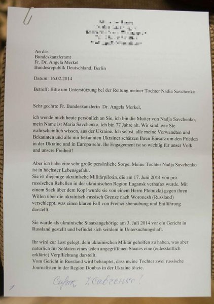 Мать народного депутата ("Батькивщина"), украинской летчицы Надежды Савченко Мария написала письмо канцлеру Германии Ангеле Меркель с просьбой посодействовать освобождению ее дочери, передает "РБК-Украина" со ссылкой на сегодняшнюю публикацию в немецкой газете Bild.