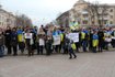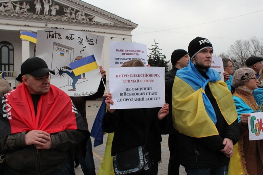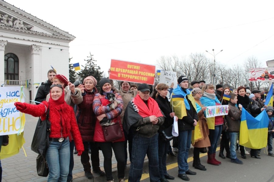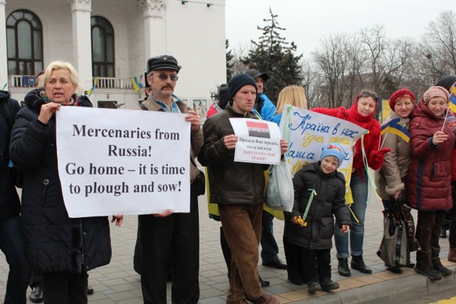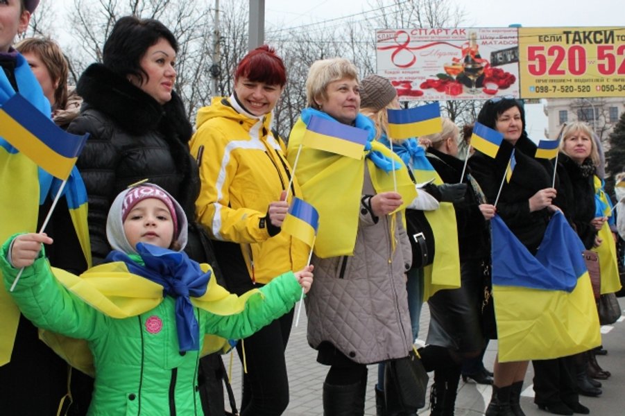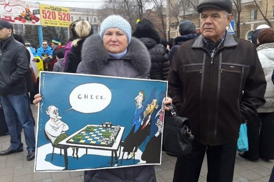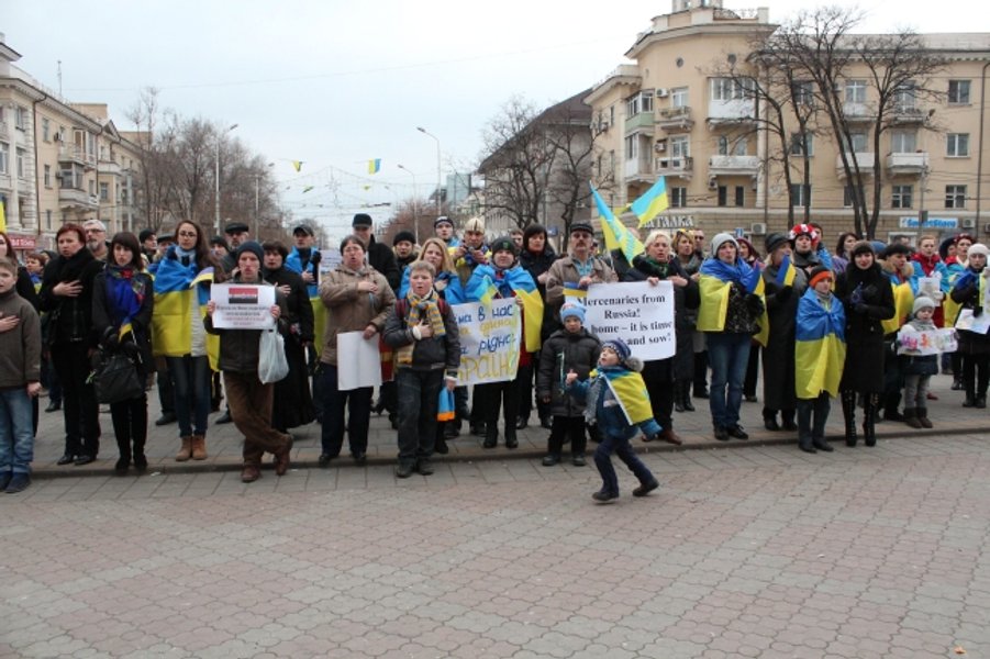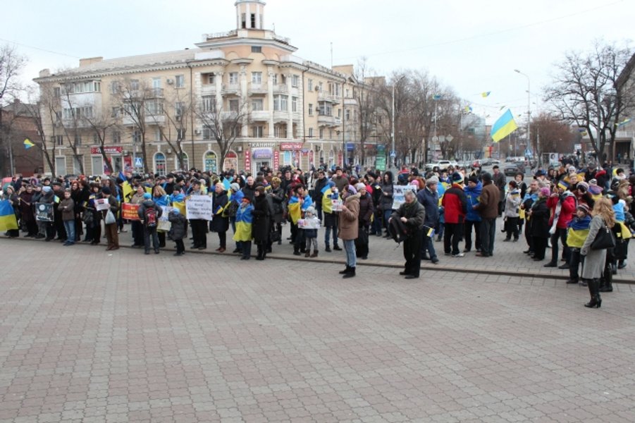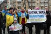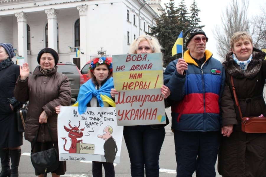 В Мариуполе прошел митинг против российской агрессии. Жители города с национальной символикой выстроились в живую цепь. Они держали в руках плакаты "Рашизм, возвращайся в Россию", "Мир в стиле России" и с карикатурами на российского президента.