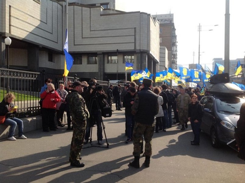 Сегодня возле здания Конституционного суда, рассматривающего закон "Об очищении власти", проходит митинг численностью до 300 человек.