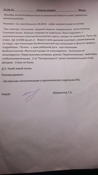 В результате первичного обследования хирург Т.А.Шерцингер поставил Куку диагноз "Ушиб левой почки" и рекомендовал экстренную госпитализацию в урологическое отделение Ялтинской горбольницы.